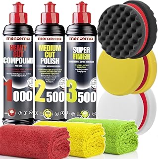 detailmate Menzerna Kit de Polissage Menzerna : Heavy Cut Compound 1000 + Medium Cut Polish 2500 + Super Finish 3500 + Polish Pads (Hard Cut, Medium Cut Soft Cut) + 3 Chiffons en Microfibre 550GSM